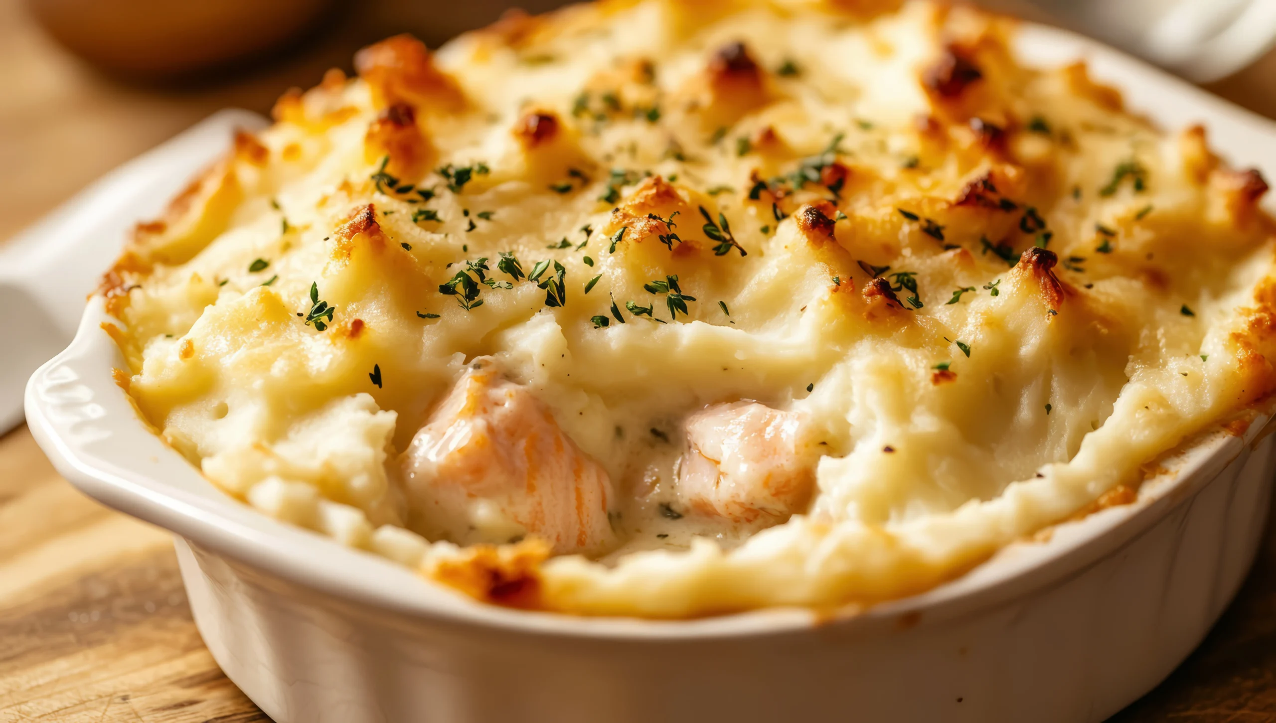 - Meanwhile, return infused milk to a bare simmer over medium heat; discard thyme and bay leaves. Add cream cheese and 1/4 cup Parmesan and stir until smooth and melted. Add to mashed potatoes along with eggs. If needed, gradually add reserved cooking liquid until consistency is thick but spreadable; season with salt and pepper. Transfer mixture to prepared dish.